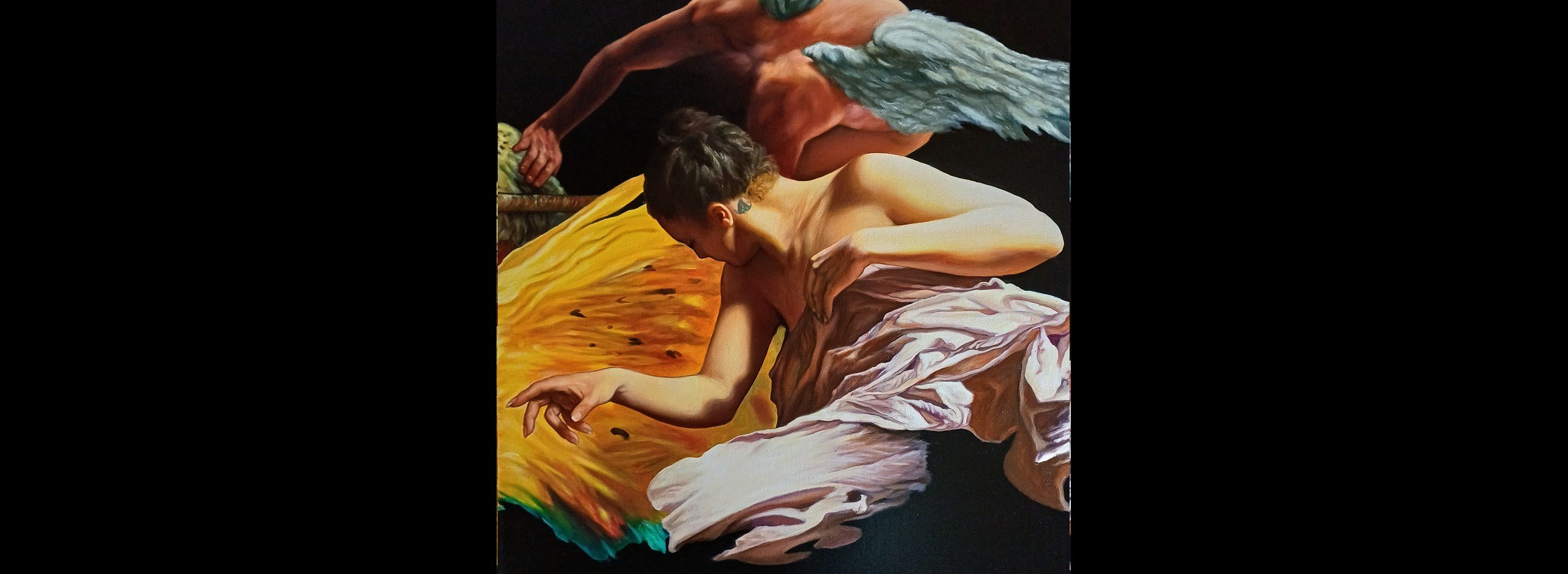 Louise Fritsch nous parle d'absolu, de finitude, de force et de fragilité. Ses chorégraphies picturales évoluent sur des fonds apparemment statiques, comme suspendues aux cordes invisibles que sont les lignes de composition du tableau. Une main essaie de percer la noirceur du ciel, une autre de s’y accrocher.